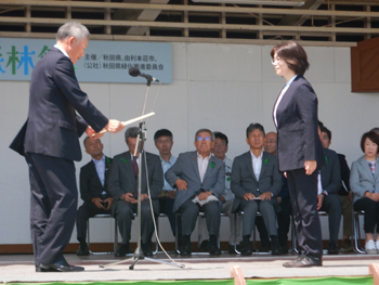 - 司会は田村陽子さん、秋田県緑化推進委員会理事長佐藤重芳氏が開会宣言をします。