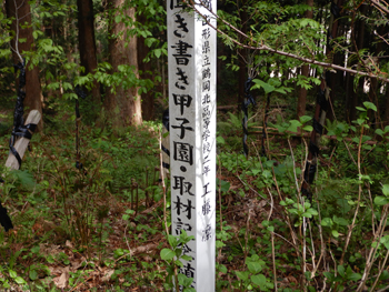 - 山は昔段々畑だったそうで、所有形態も様々で他の人の山は口出し出来ないそうです。山形県の鶴岡の高校生が聞き書き甲子園という林野庁の企画でインタビューに来たときの記念標柱です。設置には家族の皆さんで来られたそうです。