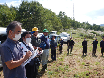 - 鹿角地域振興局の木村チームリーダー、古屋技師と話しをしていたら宮野会長が来て、植樹の歴史やきっかけを丁寧に説明してくださいました。