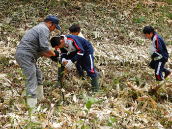 - 急斜面ではありますが、こういう時は子どもの方が身が軽いので、移動が早く作業が進みます。事前に子どもの作業斜面は下刈りされているので安全です。