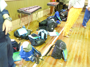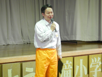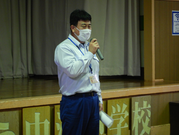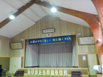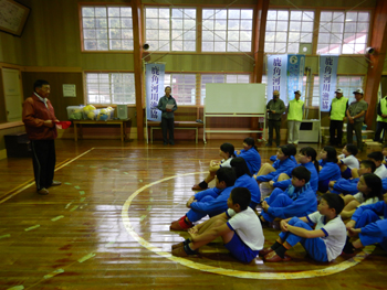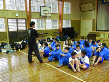 - 講堂では既に生徒さん達が待っていました。植樹のスタッフが現地会場の後始末をしているためしばし待機となりました。先生が生徒達を飽きさせないよういろいろ話しかけています。