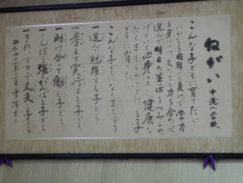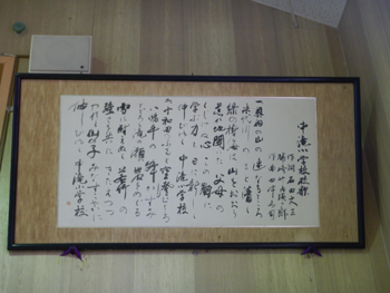 - 中滝小学校校歌と地元の方が寄贈した「ねがい」が飾られていました。数多くの子ども達が謳ったり、目標にしてきたのでしょう。 みんな良い大人になったかな?