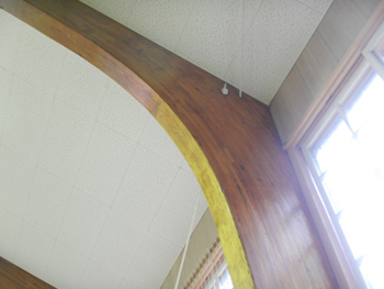 - 昭和30年建設の学校なので、私とほぼ同年代です。梁には大断面集成材が使われており当時としては近代的な造りです。