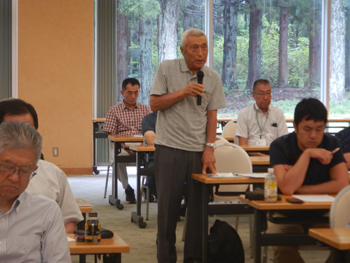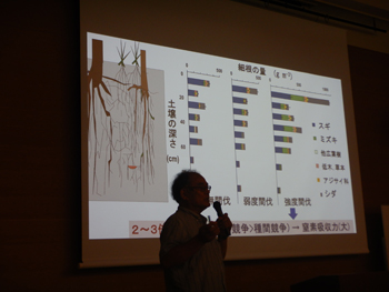 - 講演後の質問では、林業研究研修センターの和田さんから森林計画では広葉樹の標準伐期齢が25年になっているので巨木を目指すためには修正すべきでないか、武田英文氏からは強間伐することにより多様な樹種構成になった場合根茎も増えるということを改めて知った、全層間伐とはどういう間伐か、会場からは邪魔になっている木に除草剤を注入して枯らしたが根茎には影響があるのか、などの質問意見が出ました。
