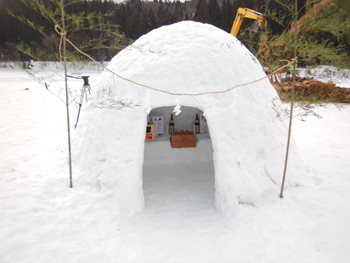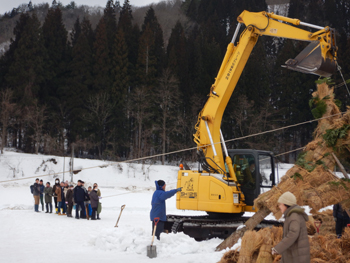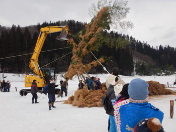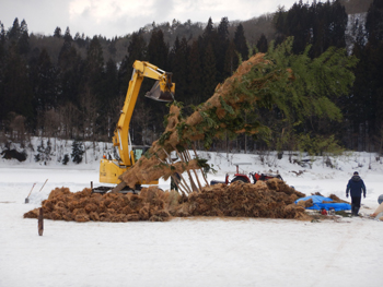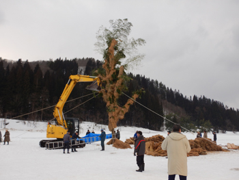 - ご神木と対峙してかまくらも作られ、水神様が飾られています。ご神木はバックホーと支え木で固定されて休憩中です。