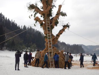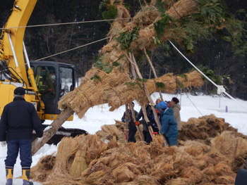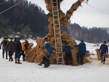 - ご神木が立ち上がると手前にあった稲わらを周囲に付け、高いところにはハシゴを使ってご神木に肉付けしていきます。結構危ない作業です。