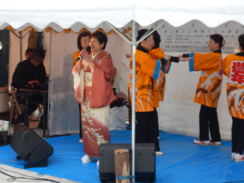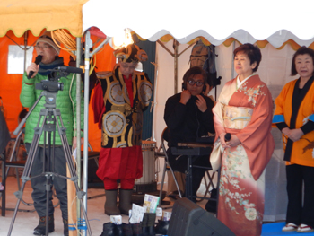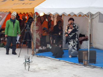 - ご神木への点火は18時からということで、今回は地域の出身者で構成する東京小猿部会の役員でもある民謡歌手の池上朝子さん(50歳を過ぎてから歌手になったそうで、全国大会で何度も優勝している)の唄や、娘さんが東京で弁護士をしている小原由美子さんの踊りなどが披露されました。