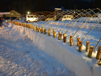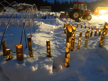- 会場に歩いて行くと、地元の小学生が作った孟宗竹の竹灯りが準備されており、次々と人も集まってきました。 最終的には300人近くになったと思います。