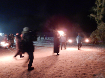 - 市長以下点火に選ばれた人達がたいまつを持ってご神木の回りに集まります。