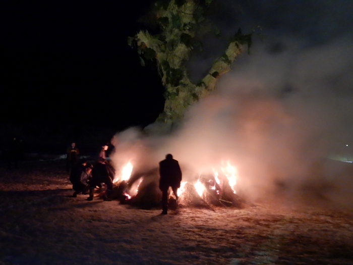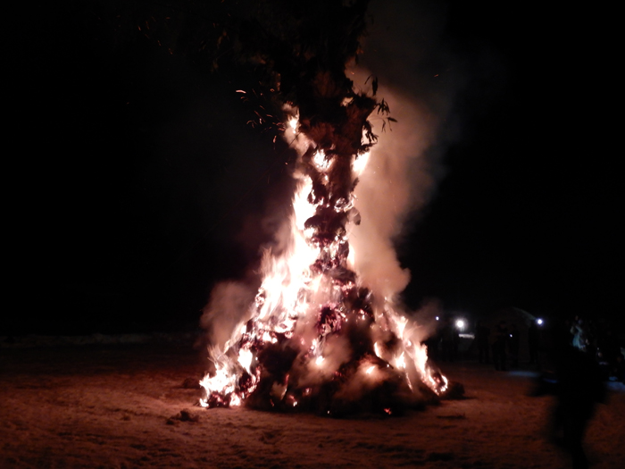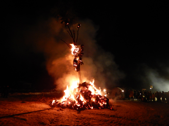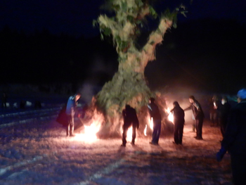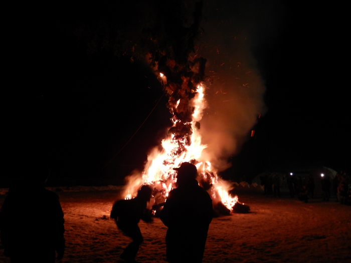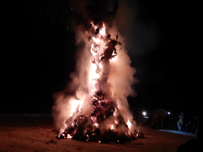 - 燃えさかるご神木。午前中に伐りだした12~13mもあるクリの木に稲わらやササ、タケ、ヒバの皮、ウツギなどを巻き付けて形を良く見せ、燃える時に音が出るようにしているそうです。実際ゴーという稲わらが燃える音、シュワシュワとササが燃える音、パチパチと木が弾ける音など、様々な音がかみ合って不思議な感覚(神様がいそうな?)になります。