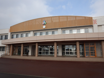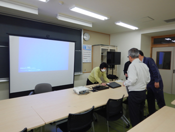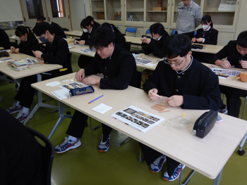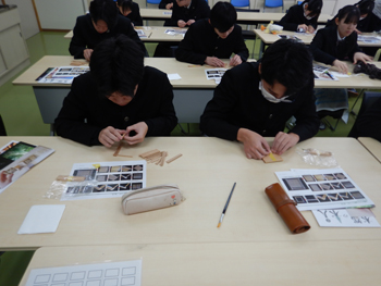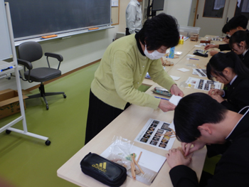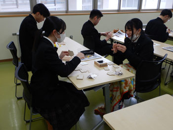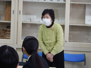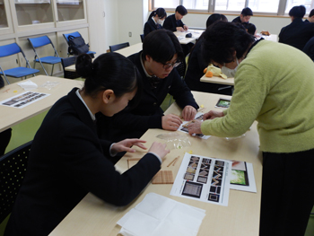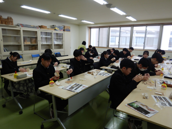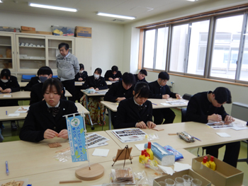 - 同校は、大館高校、大館工業高校、大館桂高校が統合して生まれた新しい高校です。正面玄関に着くとちょうど木産連の佐々木さんが到着したので一緒に受付し、担当の佐藤先生に案内してもらい実習室に着きました。