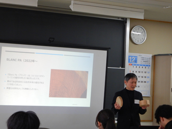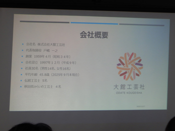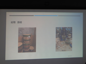 - 続いて大館工芸社の戸嶋社長から、地元を代表する木材産業企業として、会社の概要、製品の紹介、曲げわっぱの起源などが詳しく説明されました。全国に曲げわっぱの技術は存在するものの、国の伝統的工芸品に認定されているのは大館だけだそうで、秋田スギの特徴を活かした高度な曲げわっぱの技術が評価されたそうです。