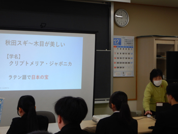 - 令和7年12月17日(水)に能代木産連が大館市の県立大館桂桜増田高校において、3年生の土木・建築科の生徒20人を対象に、林業・木材産業の社会的意義を理解して貰うため出前講座を開催しました。