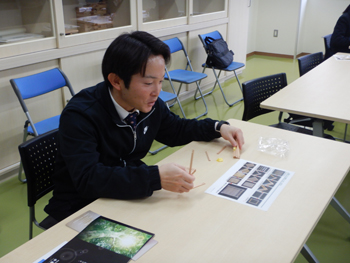 - 次に佐々木さんから、能代の木材産業や、木高研の紹介があり、木育体験として県南の小松木工の組子細工の組立をします。今までも何種類かありましたが、どれも結構難しく今回の部材も設計書を見ながらですが、皆さん苦戦しています。担当の佐藤先生はさすがに手早いです