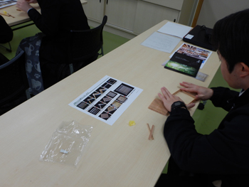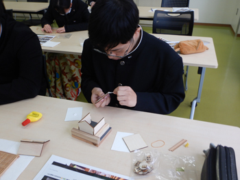 - 組子の終了した生徒は、ミニチュアハウスに挑戦です。ただし、部材が多いため時間内に終わらないので持ち帰りになりました。
