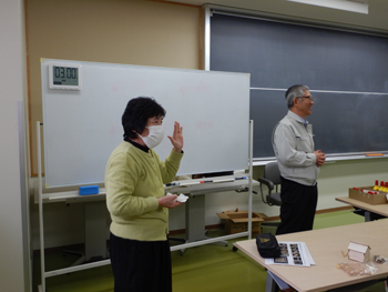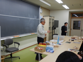 - 次に河田さんから、県で作成したカーボンニュートラルの動画を視聴した後で、森林や木材の働きについてパワーポイントで詳しく説明がありました。すごく分かり易い資料なので、聞いたら「市民センターで小学生向けに作成した」ということでしたが、曲げわっぱについても独自に作成された説明キットで解説されていました。