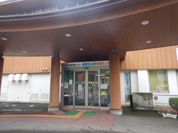 - 会場のあきた白神体験センターです。秋田市から移動して八峰町に入った頃から雨降りになりました。今日は大丈夫かな?