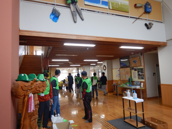 - 入口を入るとスタッフの皆さんが受付をしています。名札や記念品、軍手(右写真)などを受け取ります。