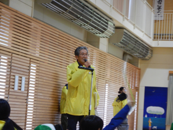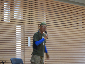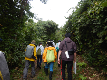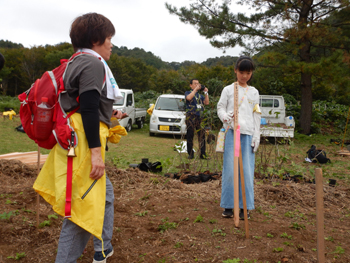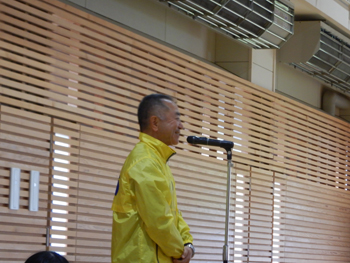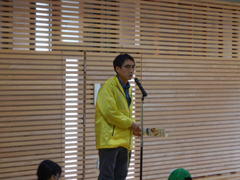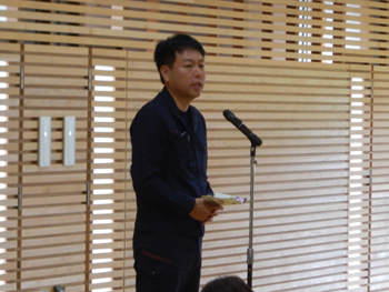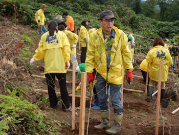 - 東京農大の橘教授からは、「ボランティアの体験をするため12名の学生を連れてきた、日本は地震と大雨などの災害大国である、長い時間をかけて自然は作られるので頑張ってブナの森を作りましょう」とあいさつがありました。