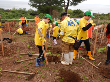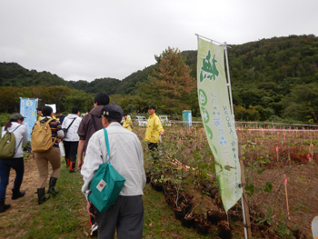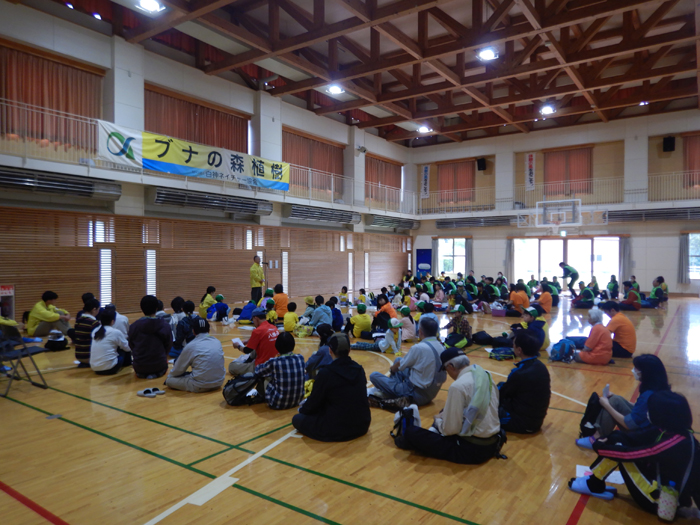 - あきた白神体験センターで開閉会式を行い、植樹はバスで移動して旧八森中学校裏の山で行われました。