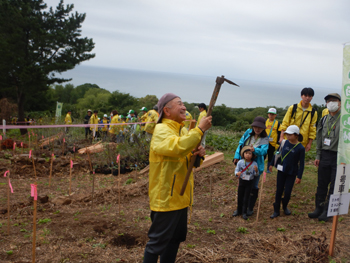 - 山崎会長が「ハタハタが獲れなくなったのが、植樹をするきっかけだった。森という字が木3本でできているので、1人3本ずつ植えてもらうが50年後は森林になり海の藻場が出来てハタハタが獲れますように頑張りましょう、天気が心配されるが私は晴れ男なので大丈夫です、雨具は要りません」というあいさつがありました。