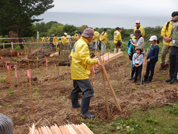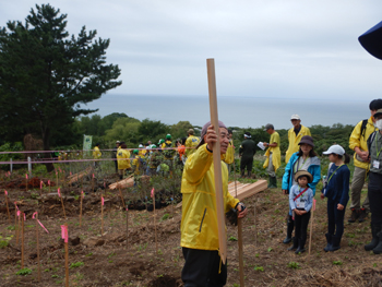 - ここでも山崎会長が説明します、本当に何でもやる会長さんです。現在目印が着いている棒は抜いて、杭は山側に打ち、カンナ掛けした面があるので、それは山側にしないと海からの強風で直ぐ消えるので注意してください、植えた後は苗木の回りを十分に踏み固めて抜けないように、ということでした。