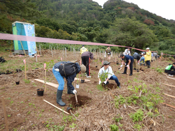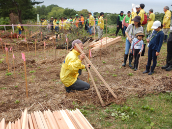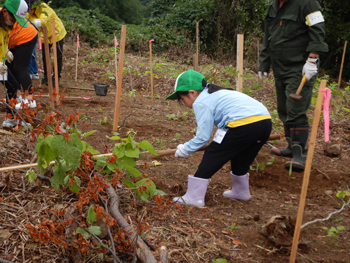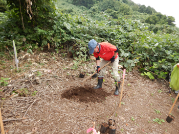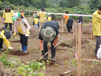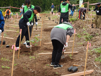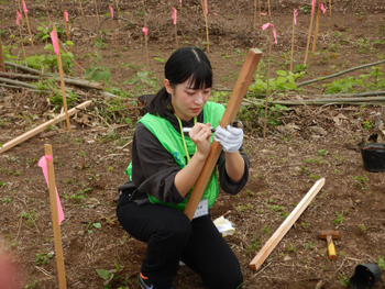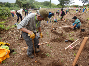 - あちこちで、植え穴を掘ったり苗木を固定したり、杭を打ったりと皆さん一生懸命作業しています。