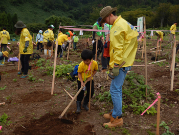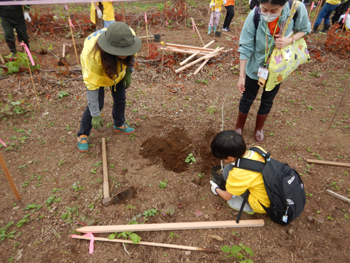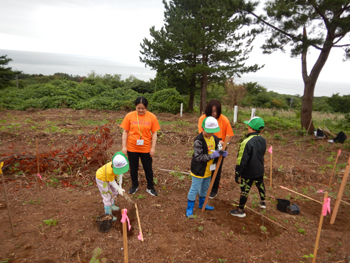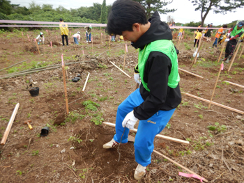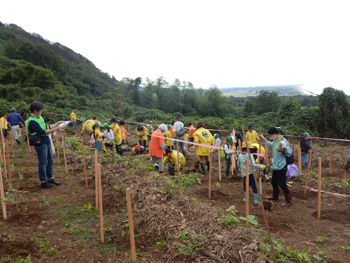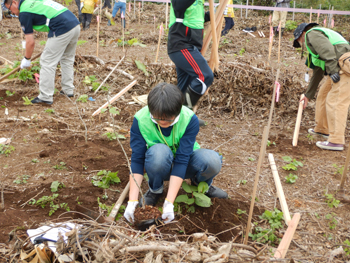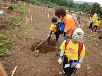 - かなりの人が集まり何とか子ども達のブロックも植栽しました。橘先生、県の森林ボランティア登録している小山さんも頑張っています。