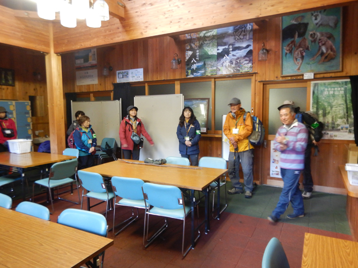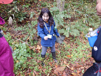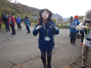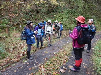 - バスに20分ほど乗り、水の目林道の入口に着いて、5班に分かれます。私は2班になり、ガイドは秋元さんです、学校の理科の先生をしていたそうで能代に住んでいるものの八森勤務が長かったためガイドの資格を取り地域貢献しているそうです。