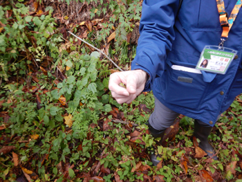 - 林内に入る坂の途中にツクバネが生えていて、実はガイドさんがビニール袋に入れて見せてくれました、半寄生植物で他の植物(樹)の根に寄生します。