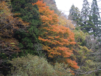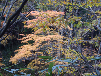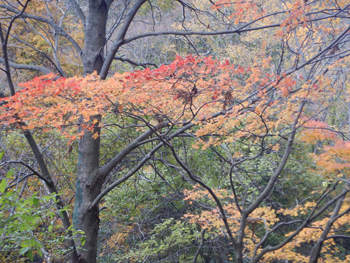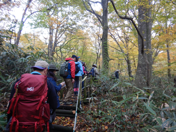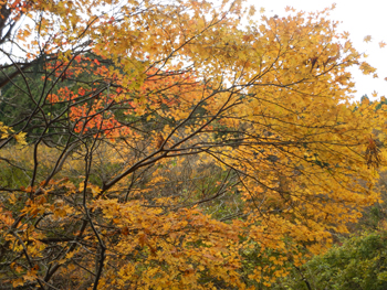 - あちこちに紅葉している樹が出てきました。つい先日、春に来たときは残雪があって、キブシやニリンソウ、ワサビの群落が迎えてくれましたがアッという間に紅葉の季節になりました。