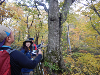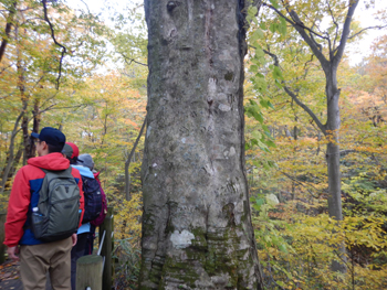 - 留山で一番のブナ、樹齢350年、あちこちにクマの爪痕が付いています。パワースポットということで元気をもらうため皆さん撫でていきます。
