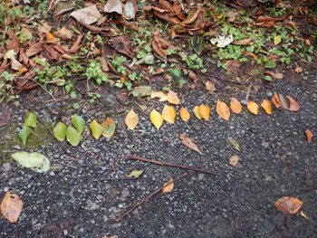 - 途中でガイドさんが、色々な色のブナの葉が落ちているので、なるべく違う色の葉を3枚採りましょう、と言われ、最後に皆さんが採ってきた葉を順番に並べました。すると写真のようにキレイなグラディエーションになりました。同じ時期でいろんな色の葉があるものです。