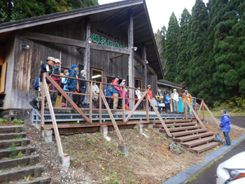 - 現場に着くと空も晴れてきました。クマ騒動の真っ只中ですが、皆さんクマ鈴とスプレーを持参しており装備を見ても山歩きのベテランの方ばかりのようです。
