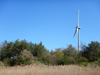- 象潟IC近くの目印の風力発電機と、苗畑入口の看板です。なんか懐かしいというか・・・。