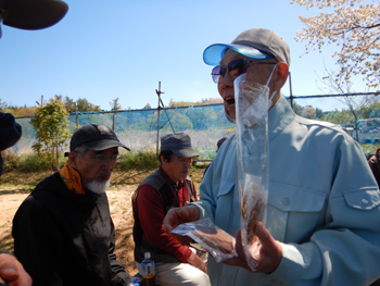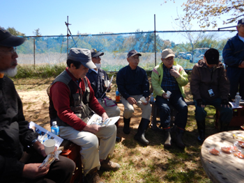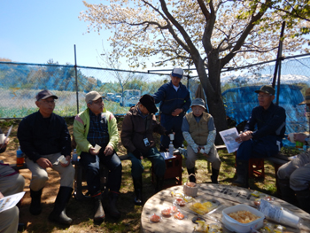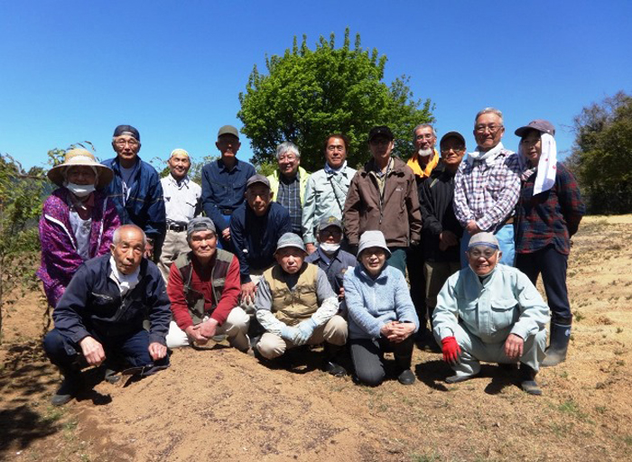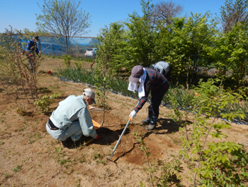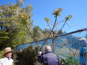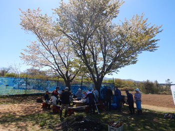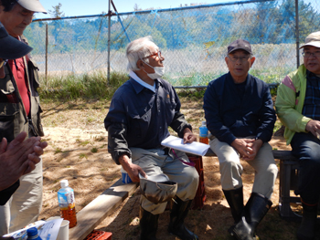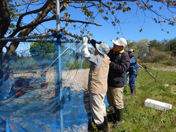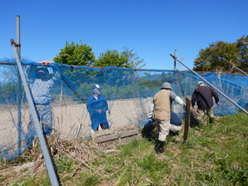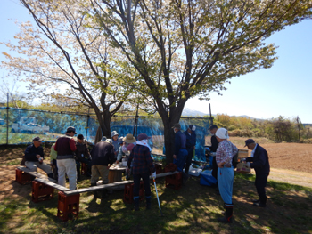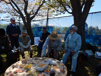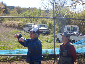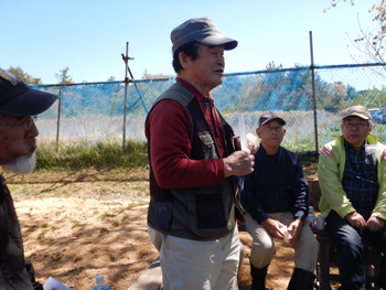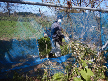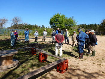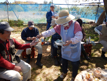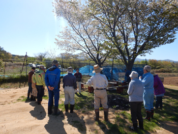 - 今年最初の作業ということで、須田会長からあいさつがあり、繁野さんから作業内容について説明がありました。男性陣は主にフェンス回りの防風ネットがかなり痛んでいるので、その修繕。女性陣は草抜きですが、会長が籾殻を厚く播いていたのとだんだん苗木も少なくなったので草もあまり生えていませんでした。