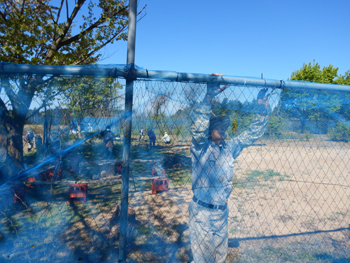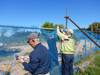 - 結束バンドや細ロープを使って、破れた防風ネットを修繕していきます。圃場の中から外から連係プレーでみるみるキレイになります。