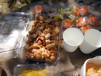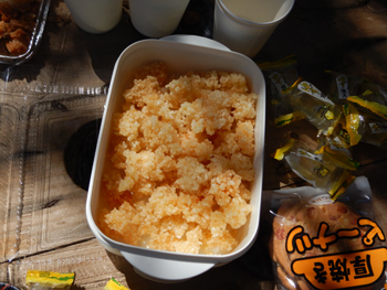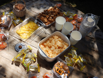 - 今日のおやつは、揚げ餅とパイナップルを薄くしたもの、干飯をオリーブオイルで揚げ塩味を付けたものが中心でした。山の非常食に良さそうで、美味しく頂きました。