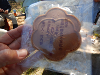 - 竹内さんからは、青梅マラソンに出ていたときにお世話になった東京の煎餅屋さんに蚶満寺のガイドをやっている記念に煎餅を作成してもらったとのことで私も1枚頂きました。