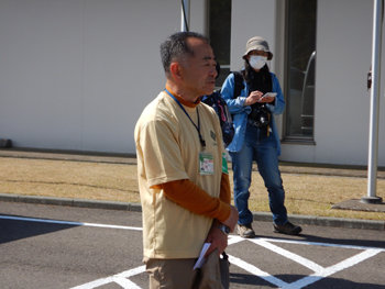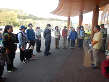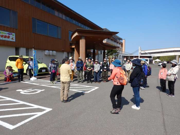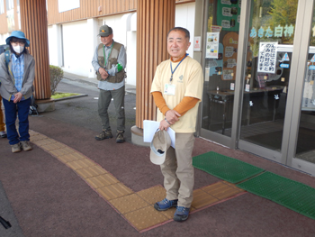 - 8時50分開会式の予定でしたが、参加者が揃ったため早めに始まりました。晴れ男の山崎会長からあいさつがあり、本日の担当ガイドが紹介されました。