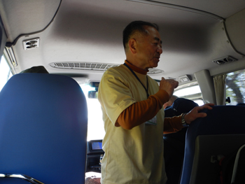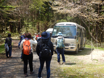 - 今年の参加者は27名なのでバスとワゴン車の2台で移動です。 車中では会長から説明がありました。