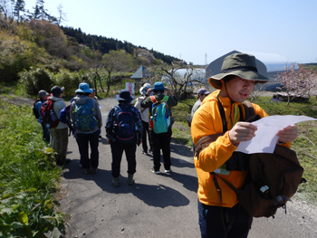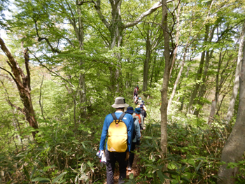 - 水の目林道の入口に着いて、3班に分かれます。林道を2km歩いてから留山を歩きます。.私は2班の宮井さんの班に入りました。新潟出身で能代に来て3年目だそうです。今回が初めてのガイドだそうで緊張しているとのことでした。