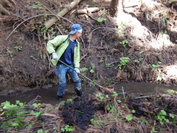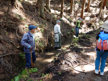 - 林道脇の側溝では地元の方達が管理作業を実施中でした。側溝が詰まらないように冬の間に積もったゴミを掻き出します。 社会的な勉強にもなります。