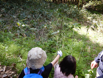 - 子ども達も元気よく歩いています。ササの花が咲いていて二人で観察です。