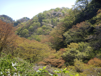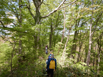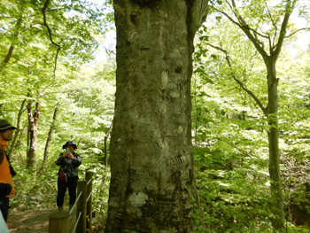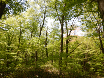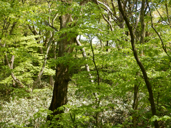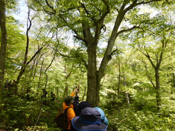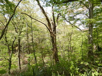 - 林内に入る春の陽差しが強くて、眩いほどのブナの新緑です。残念ながらナラガレが蔓延しているようでミズナラの大木は殆どが枯れていました。