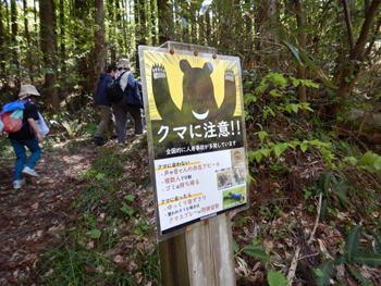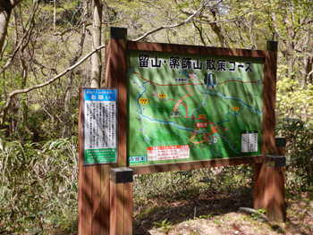 - 留山入口の看板です。ここで留山の由来を山崎会長の説明で聞きます。入口には自然保護課のクマ看板がありました。