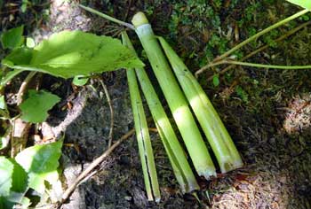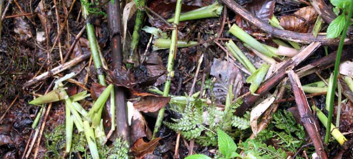▲旬を過ぎた長刀のようなタケノコを食べた食痕(6月、太平山系) |