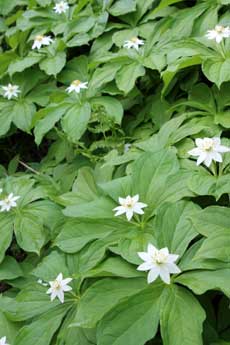 日本特産種の中でもキヌガサソウは、白い花びら状の花被片が、6、7、8、9・・・と安定しない。不思議なことに、花被片が8枚のものは葉も8枚が輪生し、花被片が9枚のものは9葉輪生・・・葉の数と花被片の数がピタリと一致し、雄しべの数までほぼ一致している。 日本海側の山地、白山、乗鞍岳以北の亜高山帯に生育する日本特産種で、良く似た近縁の仲間が見当たらない異端中の異端者とも言われている。日本特産の異端者をランク付けすれば、東の横綱がオサバグサなら、西の横綱はキヌガサソウと言われている。 |