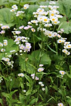 明治初年に渡来したアメリカ原産の帰化植物。今では、ごく一般的な雑草になっているが、その後に渡来したハルジオンにその場所を追われつつあるという。茎は30~150cmになり、先端に白色又は淡紫色の頭花をつける。ハルジオンに似ているが、花の頃に根生葉がないこと、葉が茎を抱かないこと、茎が白い髄で満たされていることなどで区別できる。 |