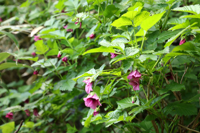 - ベニバナイチゴ・・・今年は暖かいせいか、花のつきがすこふる良い。赤い果実が相当できるであろう。イチゴ類にはトゲがあるのが一般的だが、本種にはトゲがないのが特徴。